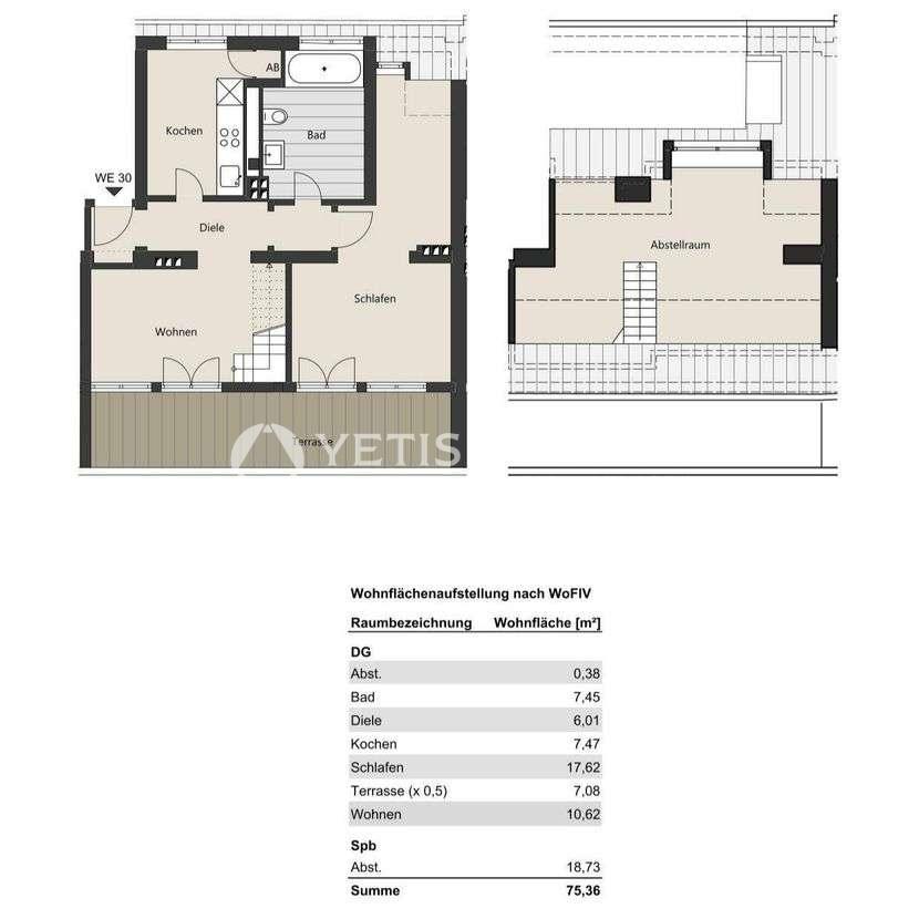 Die Wohneinheit verfügt über eine Wohnfläche von ca. 56,63 m² zuzüglich einer Abstellfläche im Spitzboden mit ca. 18,73 m² Fläche!